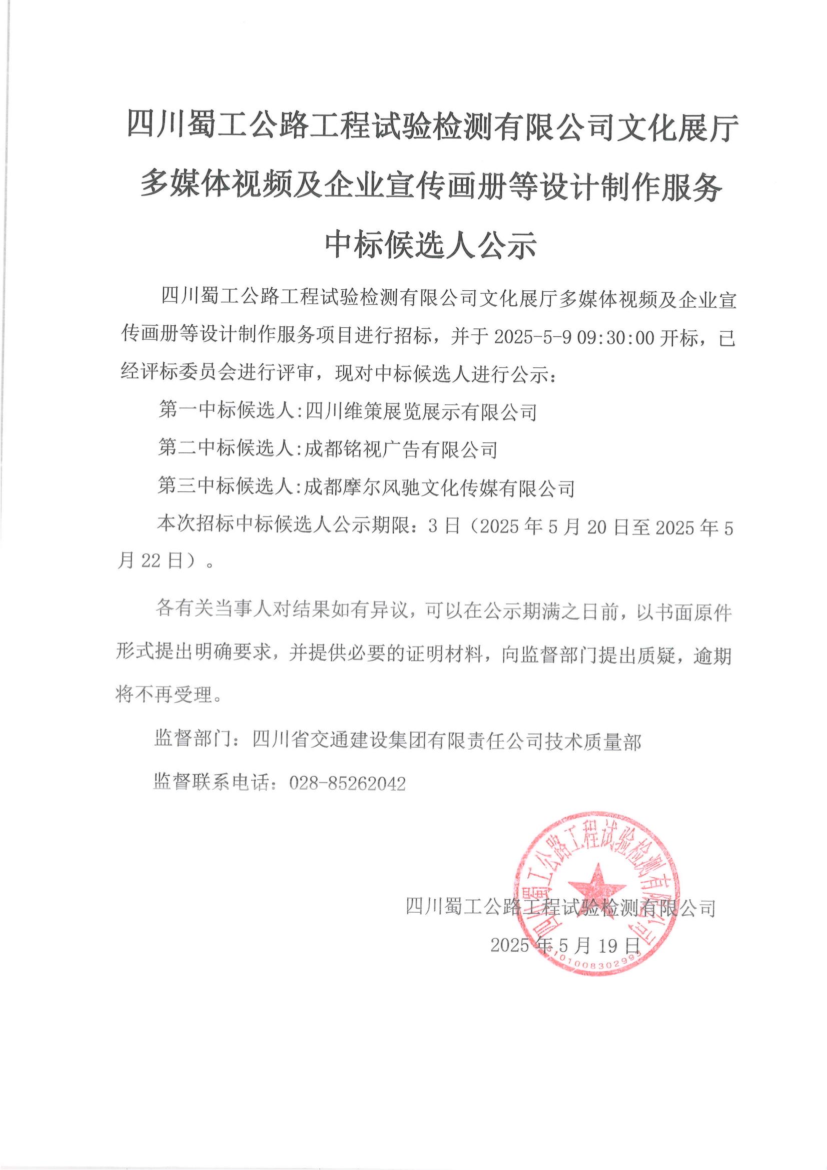四川蜀工公路工程试验检测有限公司文化展厅多媒体视频及企业宣传画册等设计制作服务中标候选人公示